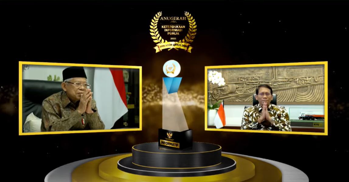 PT Kereta Api Indonesia (Persero) berhasil meraih penghargaan sebagai Badan Publik Informatif pada kategori BUMN dalam Penganugerahan Keterbukaan Informasi Badan Publik Tahun 2021, yang diselenggarakan oleh Komisi Informasi Pusat RI. Penghargaan diberikan oleh Wakil Presiden RI K.H. Ma’ruf Amin kepada Direktur Utama KAI Didiek Hartantyo secara virtual, Selasa (26/10).