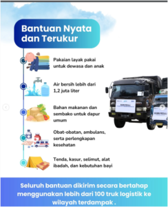 Hingga 19 Desember 2025, bantuan yang disalurkan mencakup air bersih, sembako, obat-obatan, perlengkapan kesehatan, hingga kebutuhan dasar masyarakat, yang dikirim melalui puluhan armada logistik ke wilayah terdampak.