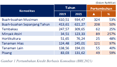 Strategi penyaluran pembiayaan BRI selama masa pandemi juga memunculkan potensi pertumbuhan komoditas unggulan baru dan hal ini bisa menjadi indikasi betapa masih besarnya potensi sektor pertanian berkembang untuk semakin mendukung kemandirian pangan. Indikasi dimaksud dapat terlihat dari peningkatan beberapa komoditas, sebagai berikut;