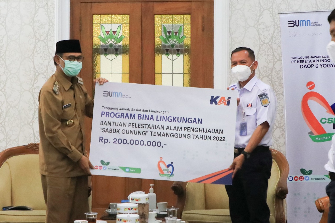 Executive Vice President KAI Daop 6, Iwan Eka Putra, secara simbolis menyalurkan bantuan 18.000 batang pohon senilai Rp 200 juta yang merupakan perwujudan Tanggung Jawab Sosial Lingkungan (TJSL) KAI tahun 2022 dalam program Bantuan Pelestarian Alam Penghijauan Sabuk Gunung di Kabupaten Temanggung,Senin (31/1). Bantuan diterima langsung Bupati Temanggung, H. M. Al Khadziq di Pendopo Kantor Bupati Temanggung, dan disaksikan oleh Kepala Dinas Lingkungan Hidup Kabupaten Temanggung, Kepala Dinas Pertanian Kabupaten Temanggung serta Tim Relawan konservasi Gunung Sindoro-Sumbing-Prau.